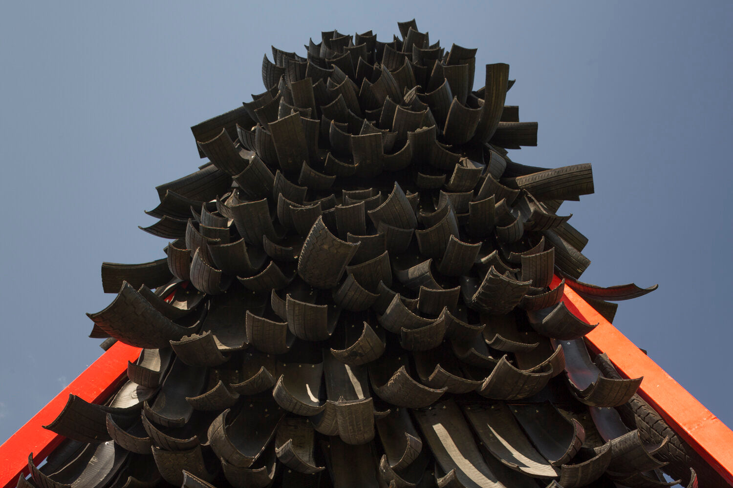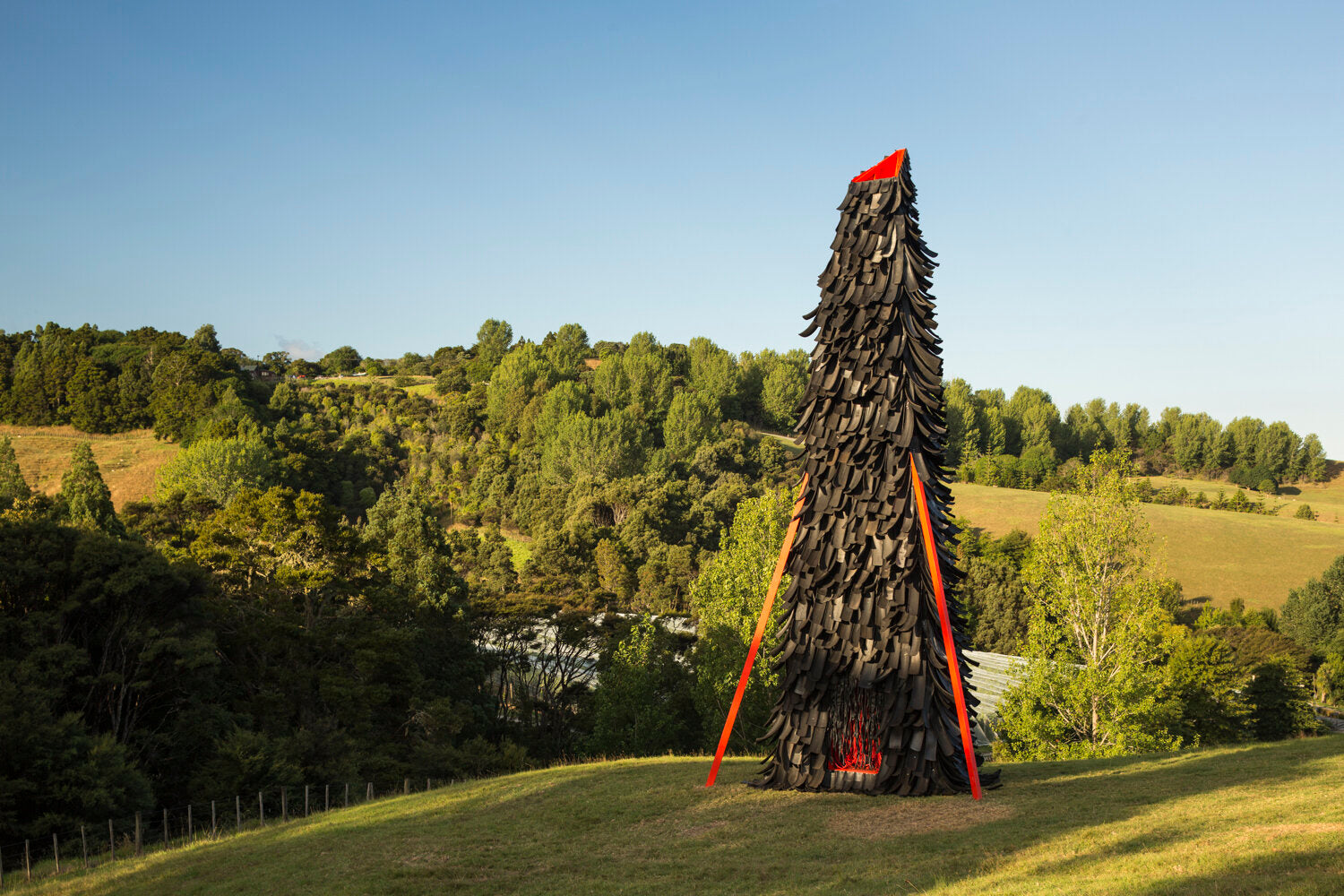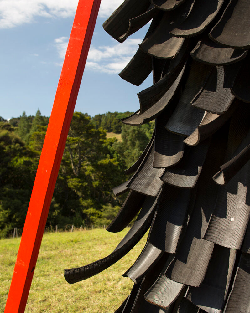 Burns described their design as “a large, shaggy beast that sits in the landscape, all covered in ragged, textural recycled tyres. However, conceptually, when you enter the project, you actually become the beast: you are the belly of the beast, which is bodily red in colour, and you identify the ribs – the structural steel members that run up the interior space.” He adds “when the fireplace is lit, the condition changes into a murky, smokey environment. It intensifies the experience of being inside the belly.”