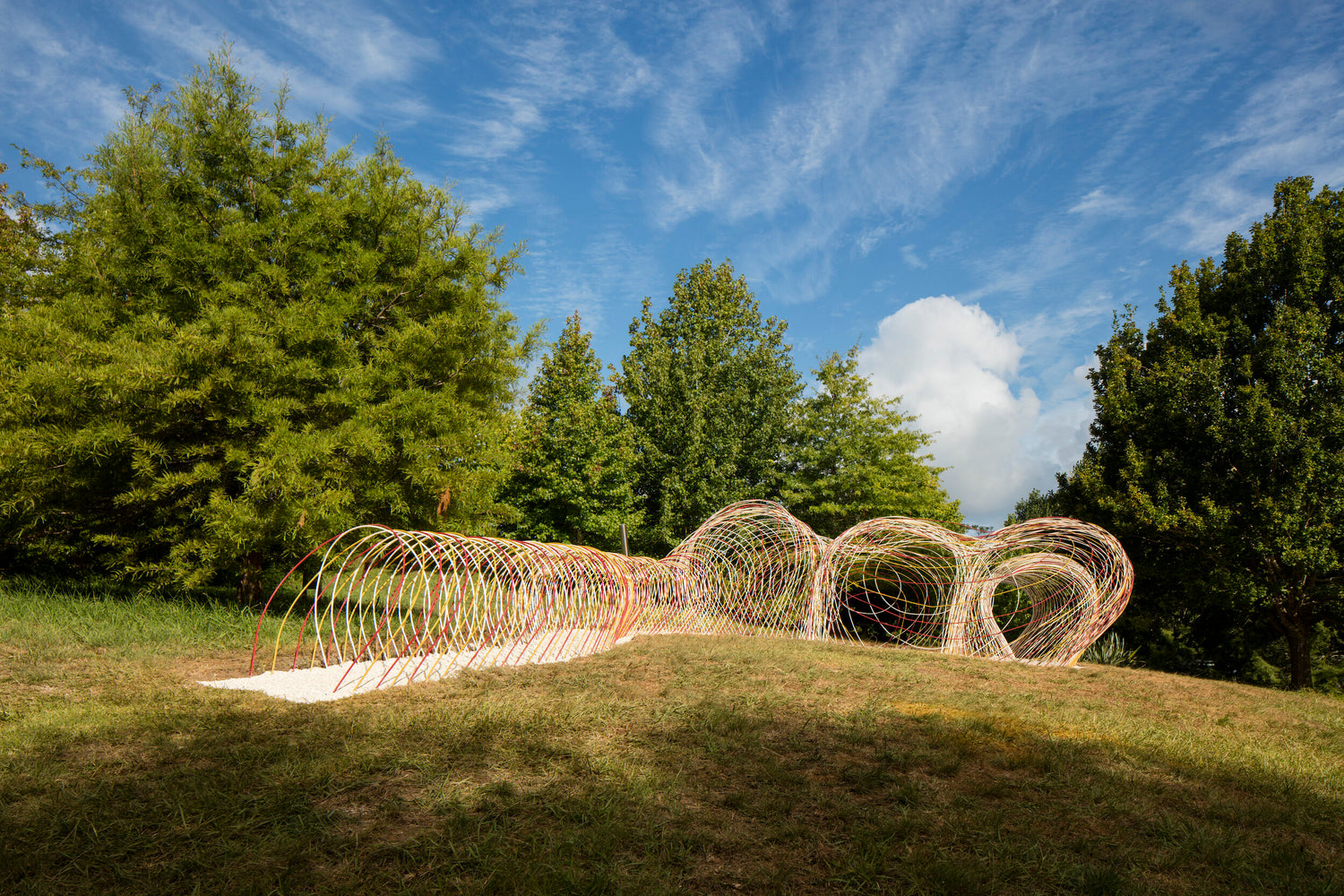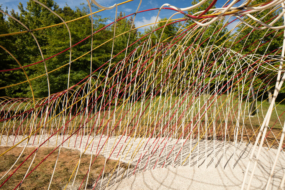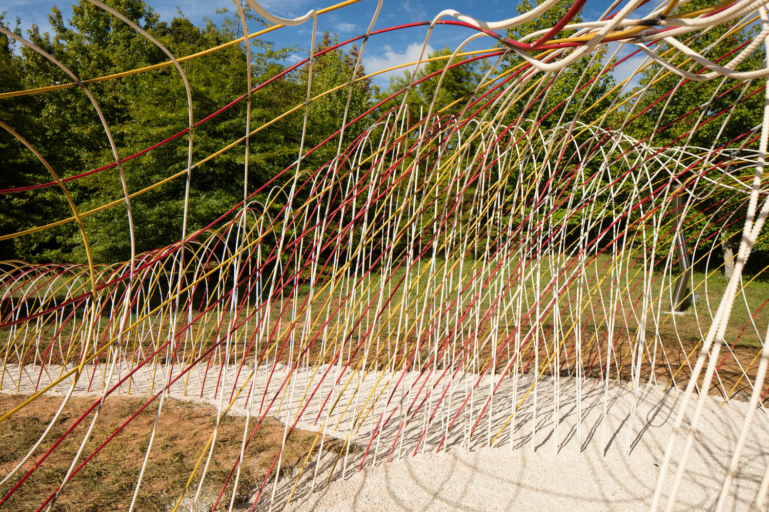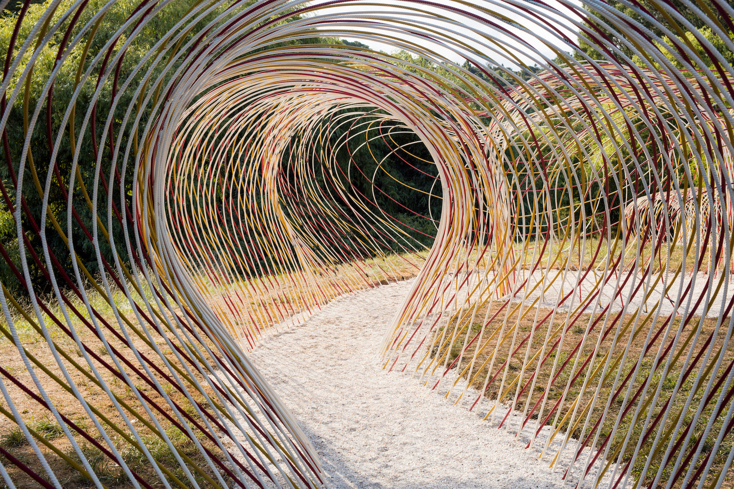 Adhering to folly tradition, Daughter of the Swamp provides no practical protection, only spatial definition. Instead it offers a bright interface between the viewer and the surrounding landscape that is observed through the gaps in the inter-laced steel.