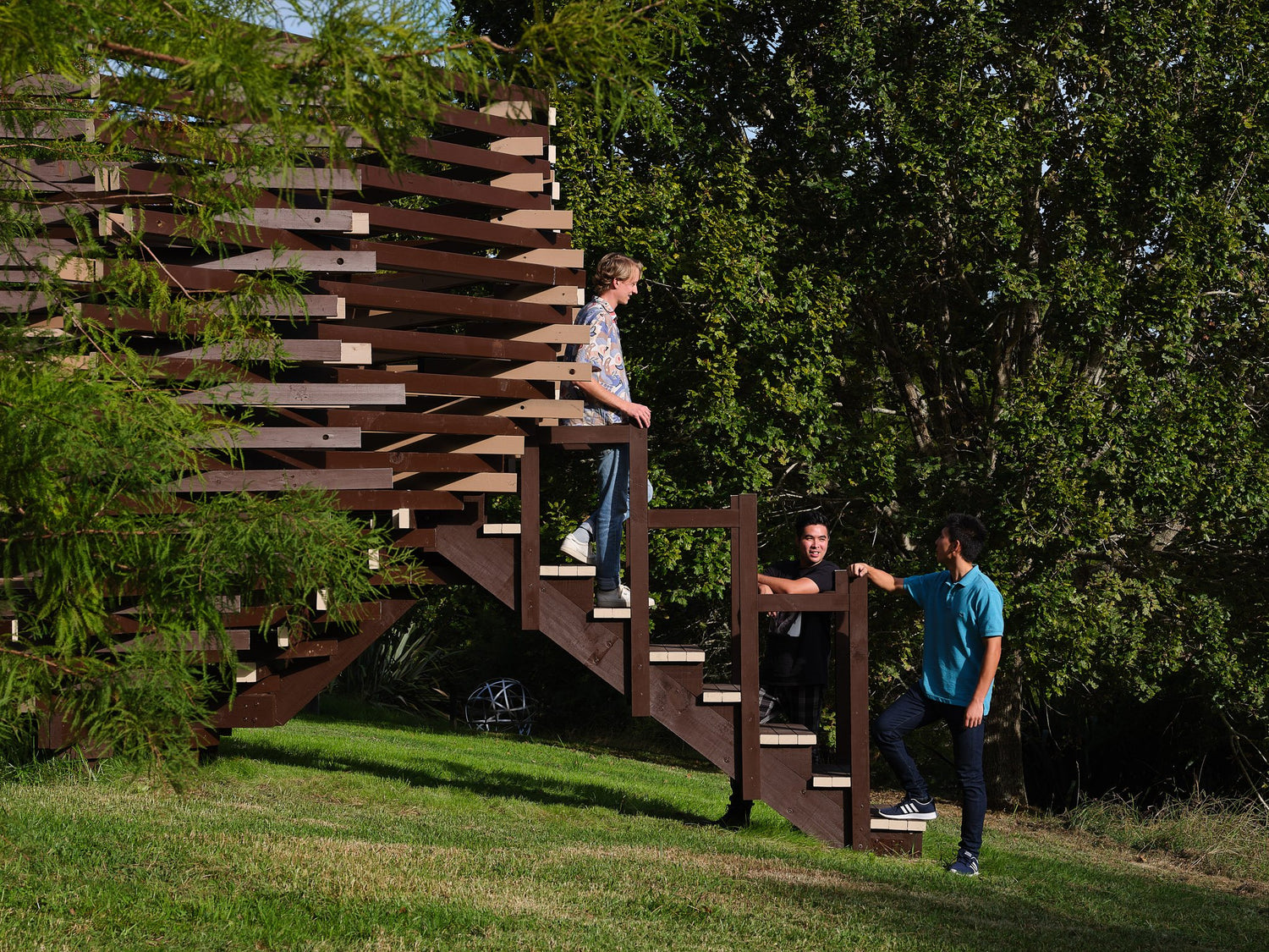 Joseph Trace, Brandon Carter-Chan and Nicholas Rowsby – three recent graduates of Auckland University's School of Architecture – submitted their winning entry The Nest in 2021. They designed and built their Folly while navigating the uncertainty of the 2021 lockdowns and were further challenged balancing the completion of the final year of their architecture degrees. The resulting 2022 Folly The Nest is a thought-provoking response to the landscape, resource use and the ever-present climate emergency.