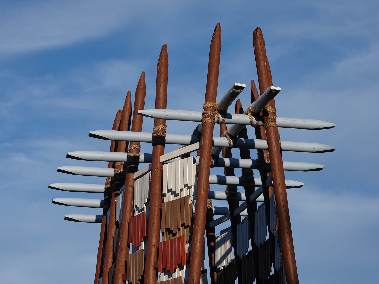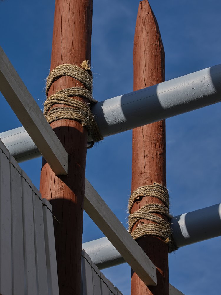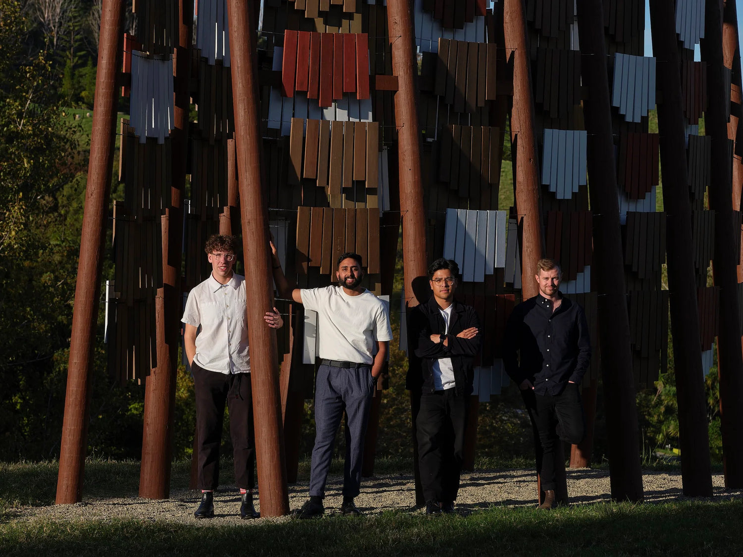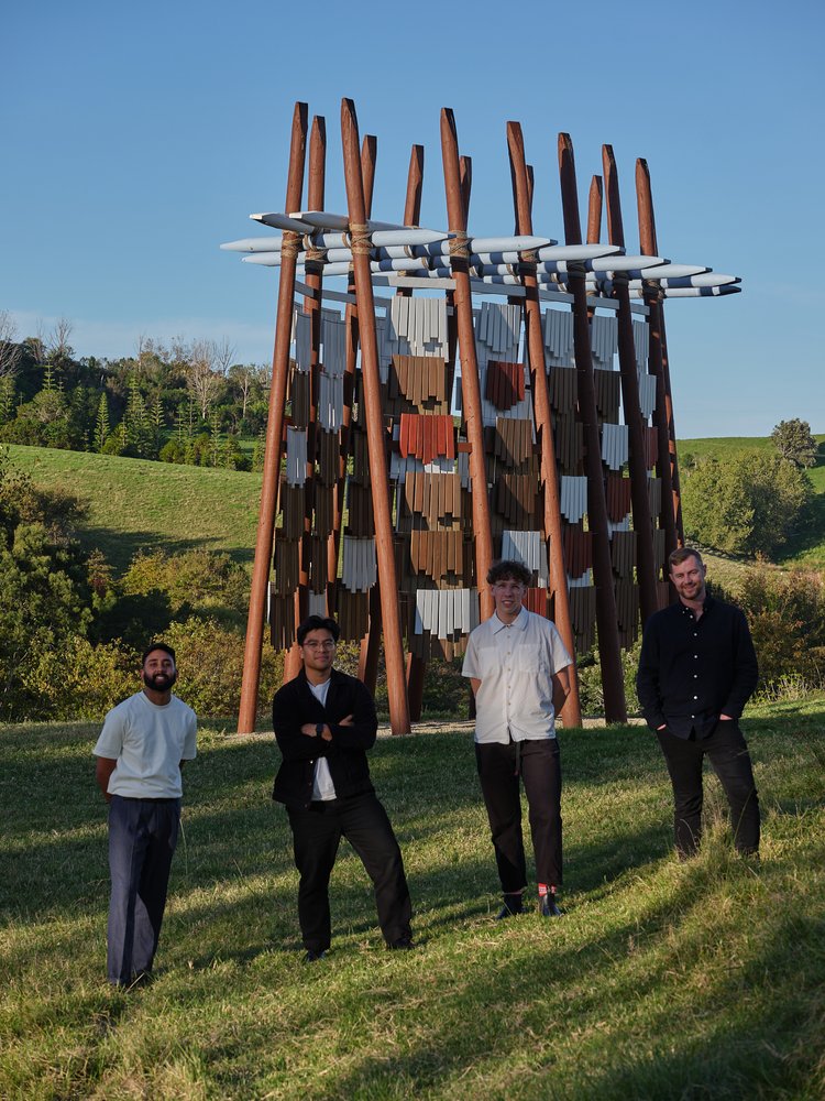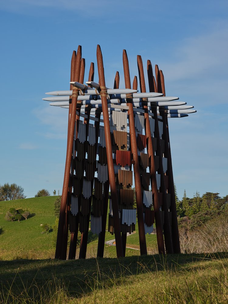Numerous prototypes were built and tested, both for quality of movement and sound, with the gradual finessing of dwangs and tension wires. Patterns for the lashings were perfected, with half a kilometre of sisal rope dyed and prepared for use. The large vertical members came from the Waikato and were chainsawed by an arborist to prepare them to go in-ground, while the kwila travelled from Christchurch, to Wellington, to Auckland, eventually arriving at Brick Bay, ready for assembly. During the course of the project, the team members collaborated throughout the country, with numerous trips made to Brick Bay for site planning, foundations, and the final build, which took over two weeks. As Architecture NZ’s Amanda Harkness outlines: “There is some irony in the fact that Cyclone Gabrielle, one of the worst weather events to hit the country in the last century, struck as the team was installing Te reo o te Hau. But the members are quick to point out that the challenges posed by the extreme weather brought them closer as a team, strengthening their resolve, and their understanding and appreciation of one another’s talents.”