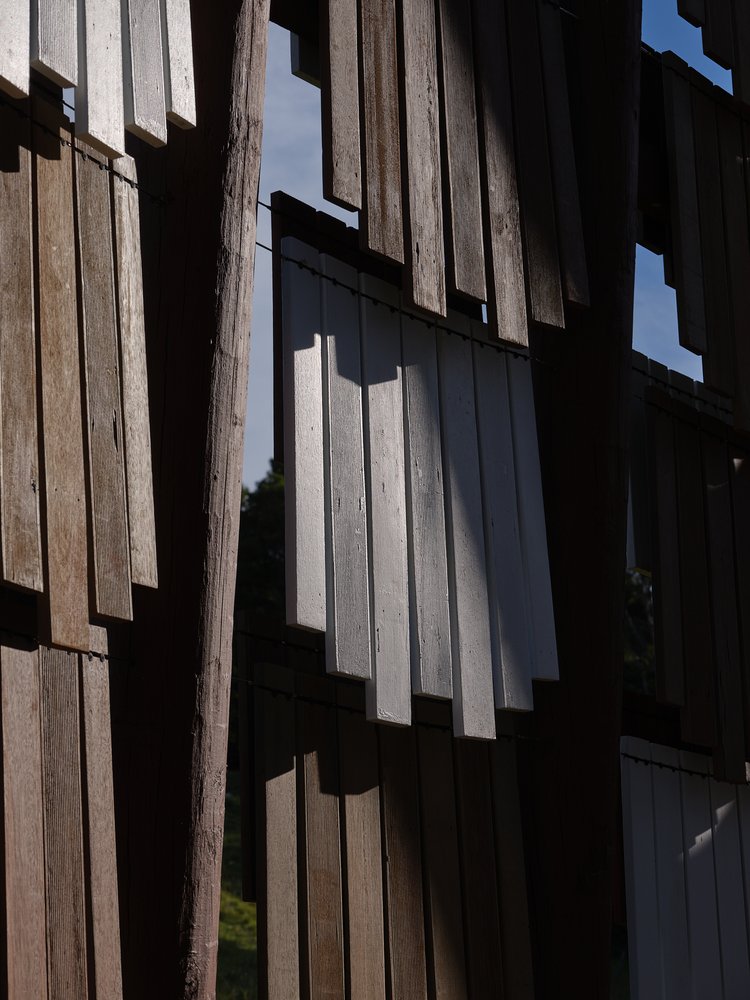 Voice of the Kōkōhau uses layers of timber shingles, strung in a way to allow precisely the right amount of movement to enable a subtle kinetic effect and, as a result, create a soft clatter of timber, like that of an earthly wind-chime. The ordered assemblage of layered shingles is designed with a multi-coloured palette of Resene paints and stains. In this way, the Folly takes on multiple meanings; not only is it the expression of the wind’s force and activation of the wind’s voice, but each of the shingles inherits the role of a feather. Collectively, the impression of a kākahu (cloak) is created, appearing to drape over the structure, which grounds the structure within the whenua. The Folly has a deeply interactive quality about it - not only in the curiosity and delight it creates through movement and sound, but in the way it encases those who visit it, encouraging them to walk through it, to be sheltered and feel connected to the elements.