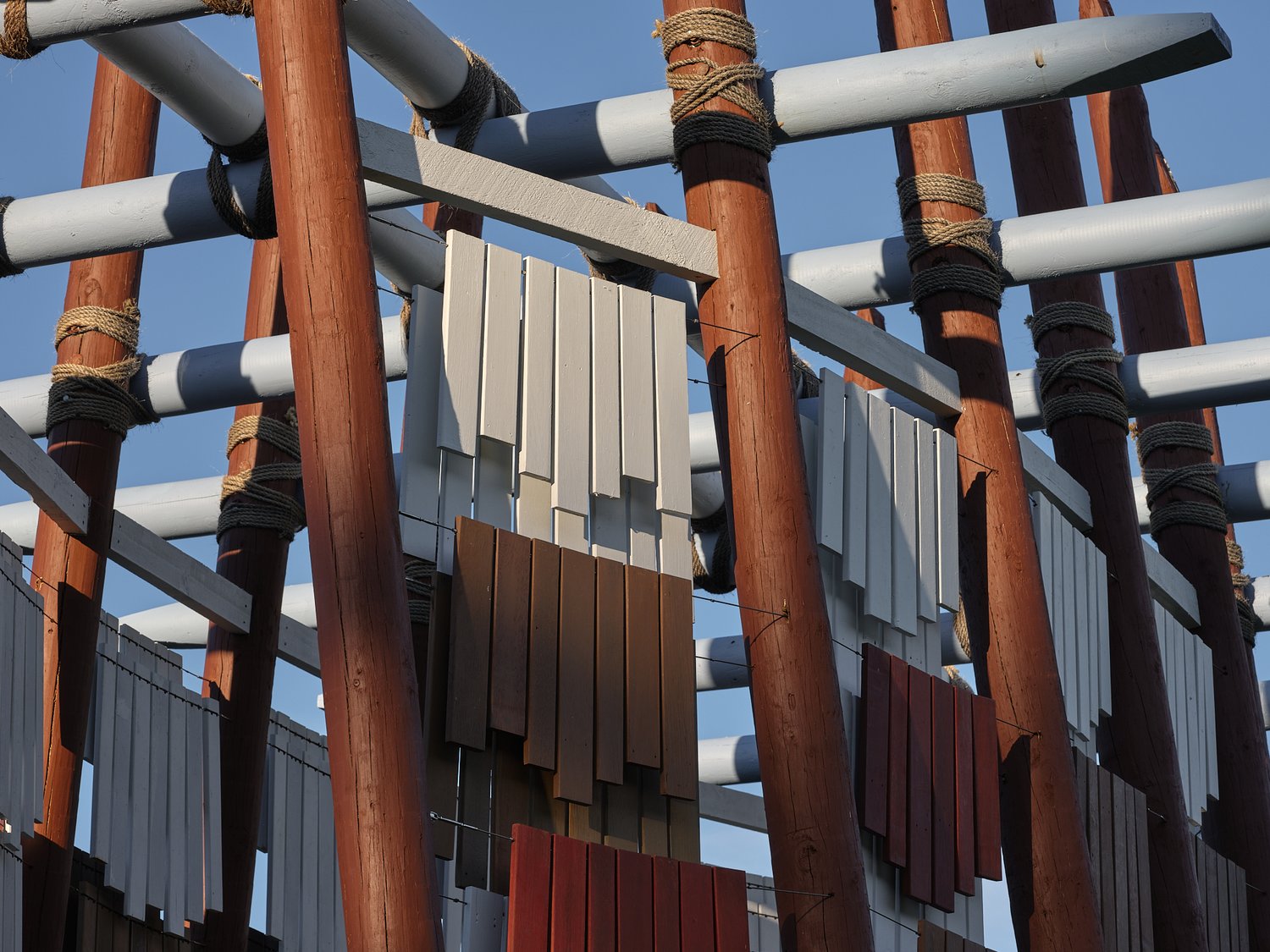 Pinus radiata, recycled kwila, stained sisal rope, stainless steel wire and fittings, Resene paints and stains