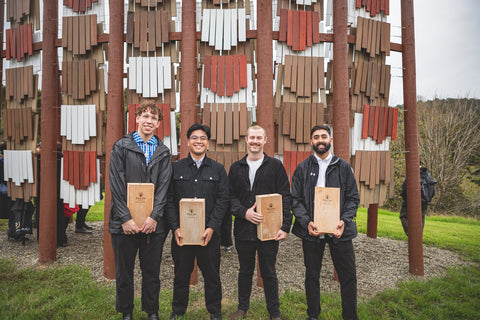 With Seth, Chris and William based in Wellington, and Mathew in Christchurch, and all of them employed full-time in professional practice, the success of the project required an impressive amount of forward planning and teamwork. The mentors encouraged the team to push their design taller and wider, resulting in the number of shingles needed almost doubling. There was a strong desire to use recycled timber where possible, therefore the kwila for the shingles was sourced and collected from numerous building sites, and, (in a testing labour of love), cut, de-nailed, cut, sanded, stained and painted. As Mathew Green recalls, “The best part of that was the timber had its own history. All the variations and the different ages show through when you’re standing up close to the folly – it’s gone through a lot of hands and that’s what makes it so cool.”