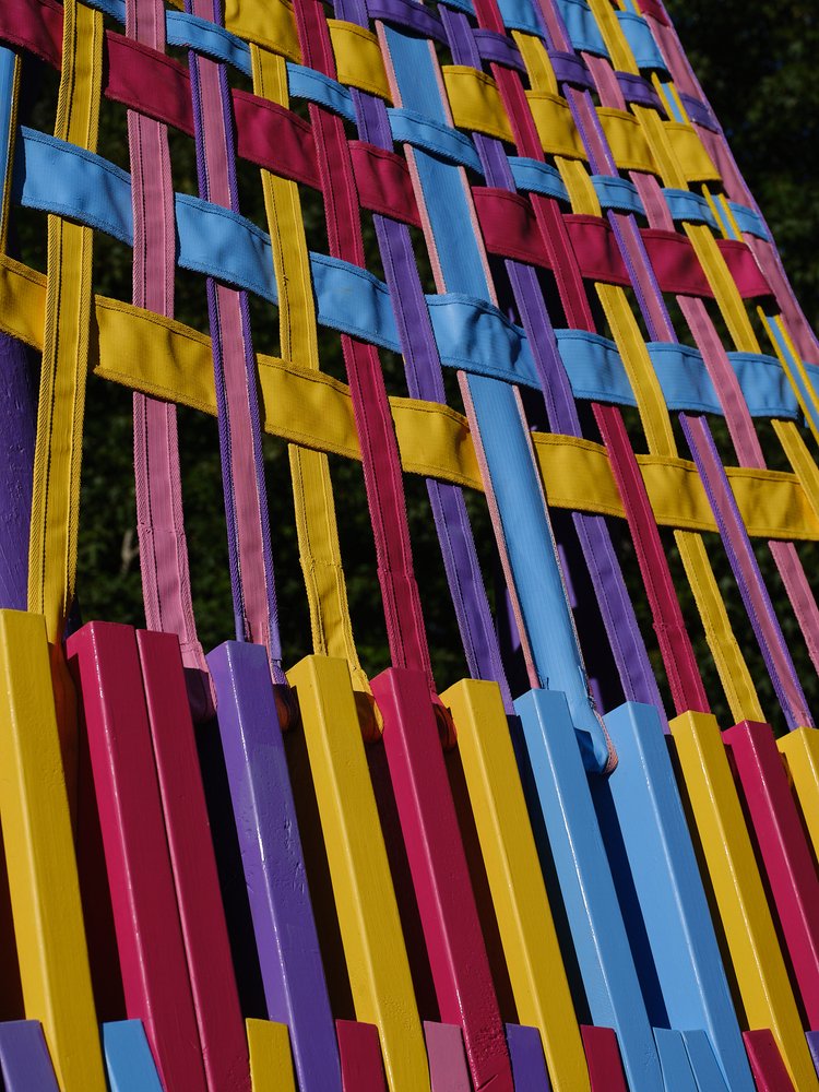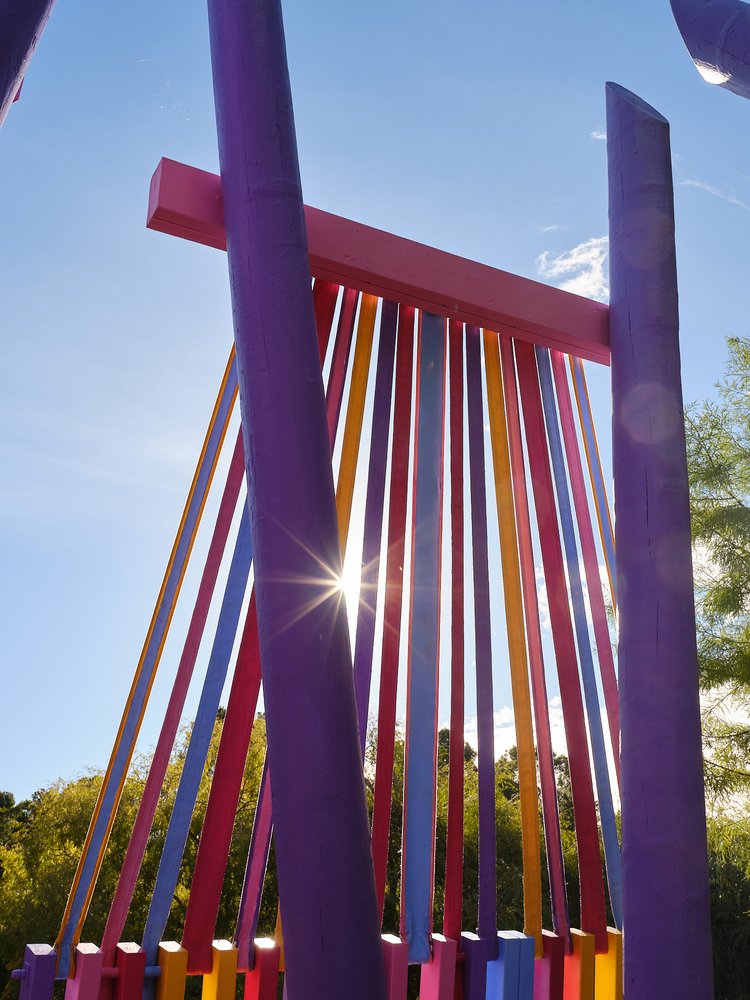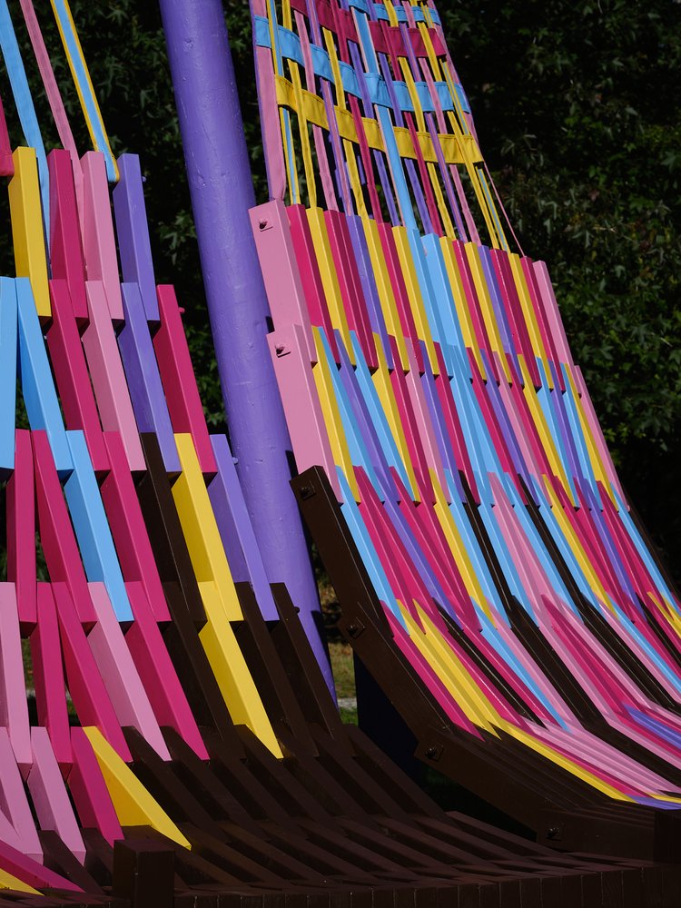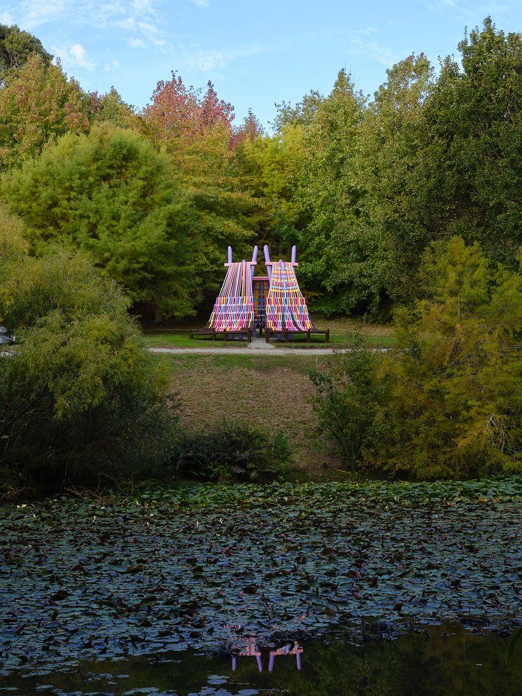 Using aptly-named Resene paint colours such as ‘XO’, ‘Bright Spark’ and ‘Colour me Pink’ to paint the woven canvas and latticed timber parts, the brightly coloured palette creates a joyful mood. As a compliment, the brown-stained timber at the base of the looms references the previous folly built on this site (The Nest), which Femme-ly Velues recycled approximately 30% of the timber from. This reclaimed timber honours the history and character of ancestral follies at Brick Bay, reduces waste, and continues the lifecycle of materials.