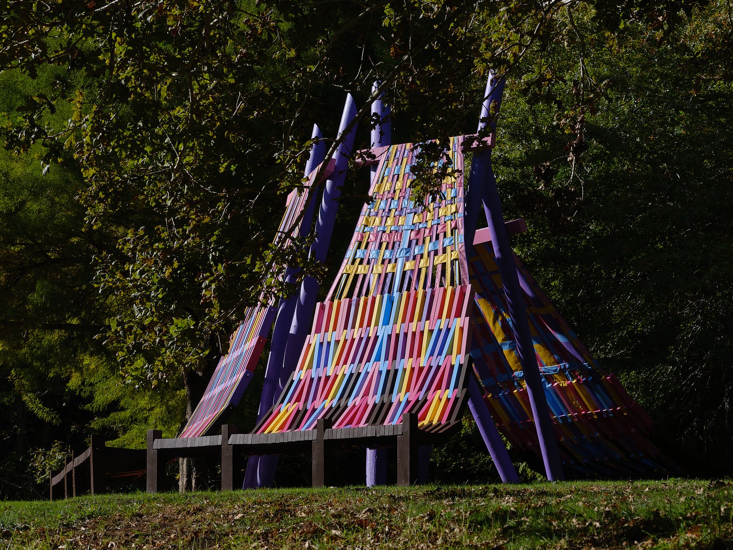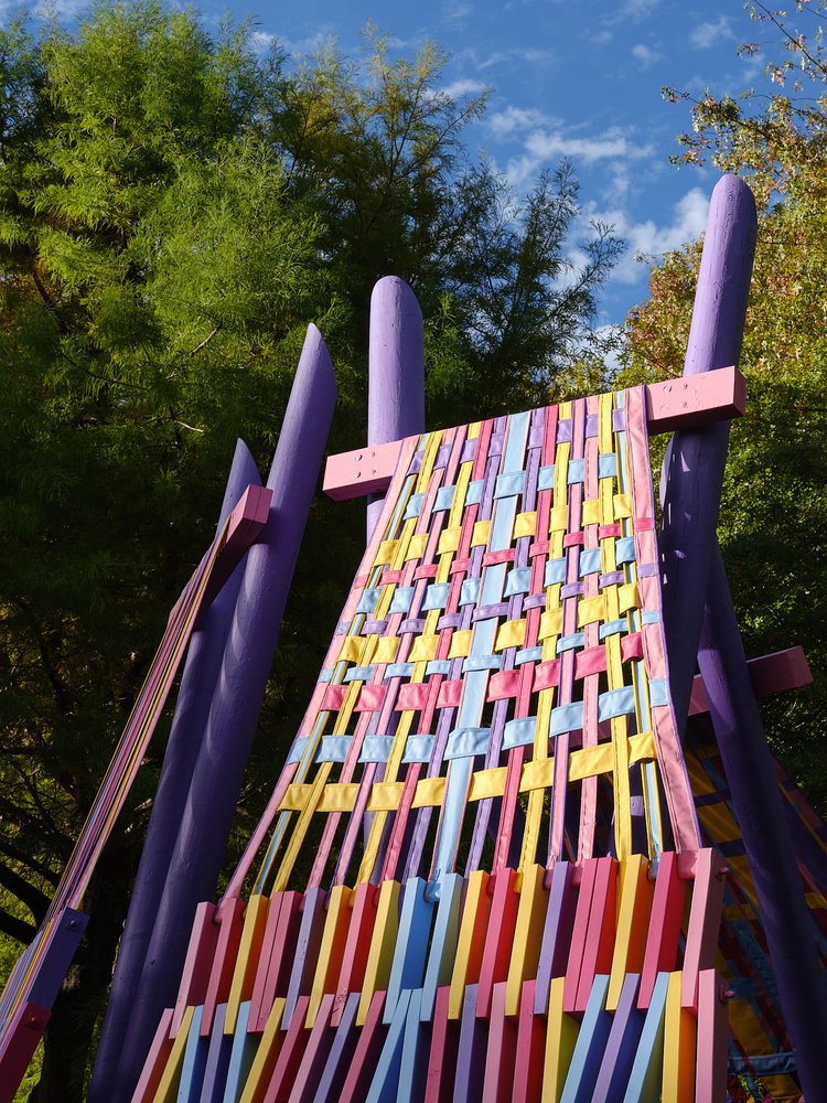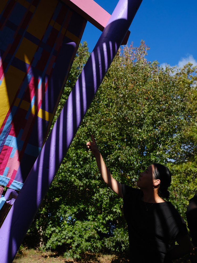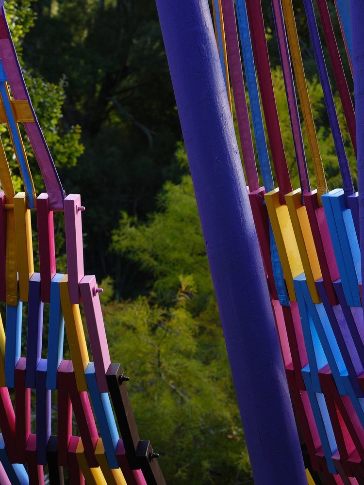 Using aptly-named Resene paint colours such as ‘XO’, ‘Bright Spark’ and ‘Colour me Pink’ to paint the woven canvas and latticed timber parts, the brightly coloured palette creates a joyful mood. As a compliment, the brown-stained timber at the base of the looms references the previous folly built on this site (The Nest), which Femme-ly Velues recycled approximately 30% of the timber from. This reclaimed timber honours the history and character of ancestral follies at Brick Bay, reduces waste, and continues the lifecycle of materials.