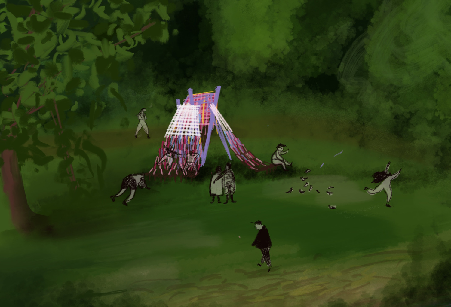 The folly’s form emerged organically from an afternoon of conversation and sketching to become three ‘bodies in space.’ As the design evolved, so did the complexity of it, mimicking the gradual building of layers within a woven piece. Ford explains: “First, the warp of the loom (vertical elements) is established, then the weft is run through, with horizontal lines running back and forth. Finally, when the elements are tensioned and compacted into a final piece, it becomes known as ‘the work’.”