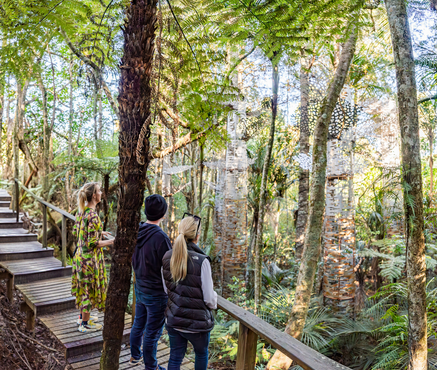 The Sculpture Trail weaves seamlessly through this landscape, leading into native bush alive with kahikatea, puriri, nikau palms, and a precious kauri forest. Birdsong fills the air—kererū feast on berries, piwakawaka dart past, and tūī and kākā call from above.